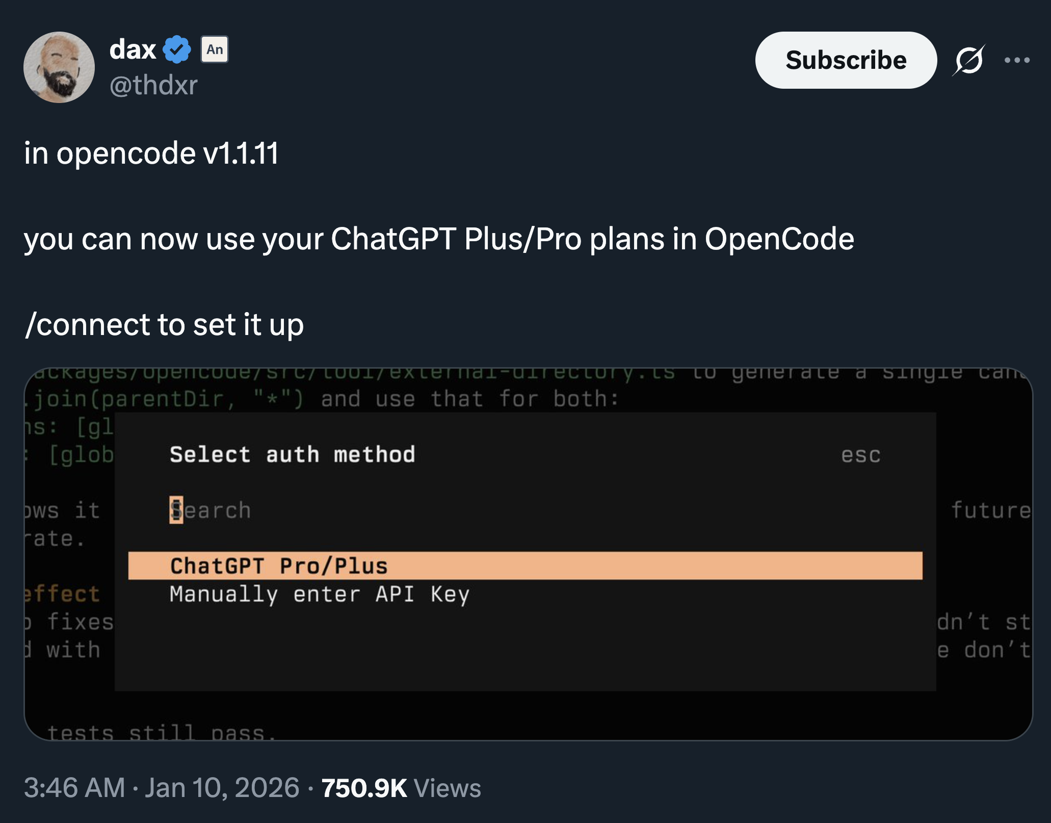 So, dax tweeted that in opencode v1.1.11, you can now use your ChatGPT Plus/Pro plans in OpenCode.