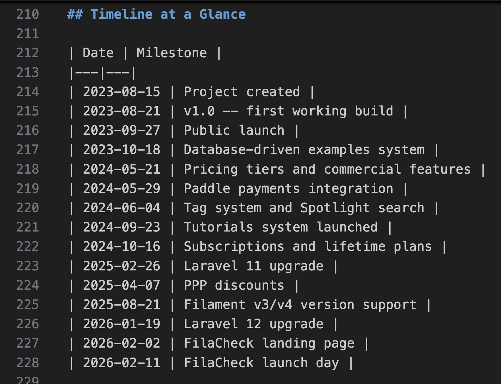 As part of the result, you have the timeline in a clear table in HISTORY.md:
